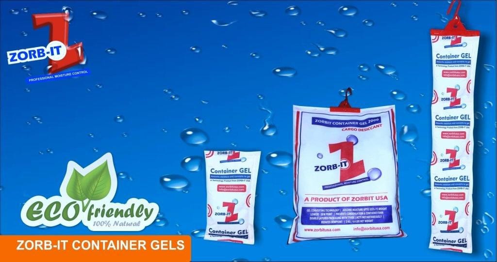 Zorb-it Container Gel is the most effective moisture adsorber with highest adsorption capacity of 325% W/w without releasing water. The use of Zorb-it reduces chances of container rain, which occurs due to condensation of water on the roof of the container & then dripping on the packaged goods. The Zorb-It Gel is formulated using a unique combination of natural super adsorbent gelling agent and desiccating additives. The adsorbed moisture is immediately converted into a gel form which tightly holds water molecules. The resultant gel does not allow dripping or leaking of water out of the pouch. The moisture adsorption process is rapid and continuous and adsorbs moisture at all humidity ranges. This product is ideal for exports of coffee, cocoa, soyabean, rice, wheat or other grains, garments, lumber, furniture, electronics, steel, chemicals etc. This also complies to the new FCC guidelines for shipment of Cocoa beans in containers.